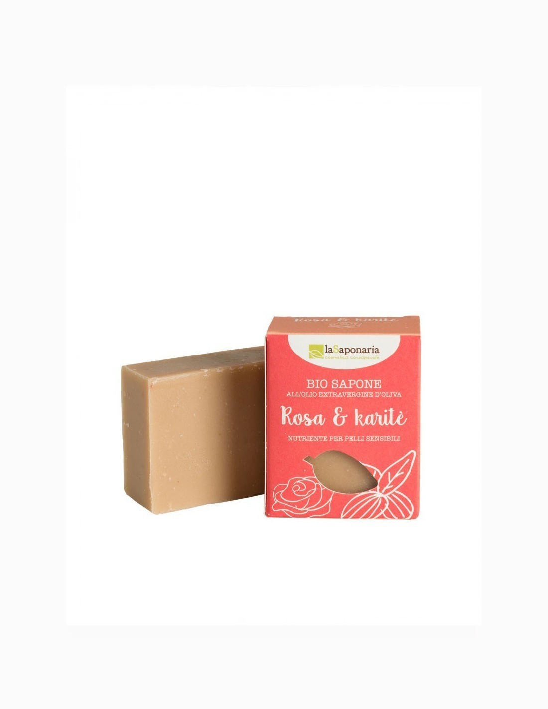 Sapone naturale con burro di Karité, per pelli che necessitano di nutrimento, arricchito con estratti di rosa canina e un mix di oli essenziali di rose e gerani che conferiscono a questo prodotto proprietà lenitive.