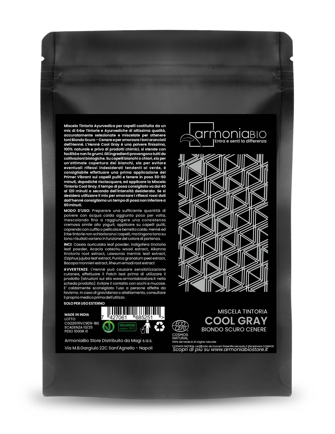 Henné Cool Gray ArmoniaBio – Tinte vegetal rubio ceniza oscuro 100% natural y orgánico, certificado Ecocert Cosmos y Vegan OK.