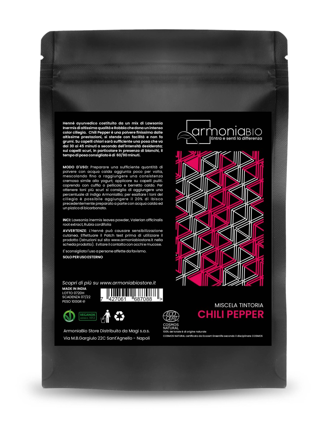 Henné Chili Pepper es un tinte vegetal para el cabello 100?% natural y ecológico, certificado Ecocert Cosmos y Vegan OK, ideal para quienes desean una coloración completamente vegetal sin agentes químicos.